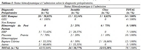 En fonction des causes de saignements, les GEU rompues, les hémorragies du post partum et les ruptures utérines ont été associées aux plus grandes fréquences de status hémodynamique précaire (instabilité ou choc), avec respectivement 41,16 %, 100 % et 66,66 % des cas [tableau I].