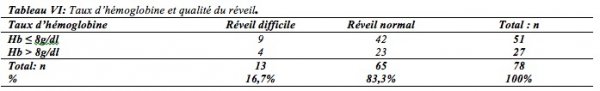 En post opératoire, la qualité du réveil a été jugé difficile dans 16,7 % (n=13) des cas [Tableau VI] et l’a été sensiblement plus chez les patientes qui avaient eu une anémie préopératoire sévère (Hb < 8g/dl), avec un odds ratio de 1,23 (intervalle de confiance à 95% [0,34 -4,44]).