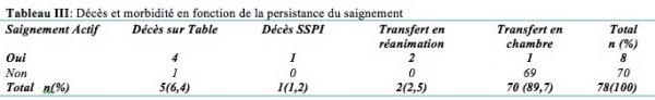6 patientes sont décédées, soit un taux de mortalité de 7,7%. Il y a eu un décès en salle de soins post interventionnelles (SSPI) et 5 décès sur table. Hors mis le cas de rachianesthésie, tous avaient un saignement actif en per opératoire. L’âge moyen des patientes décédées était de 35,5 ans.