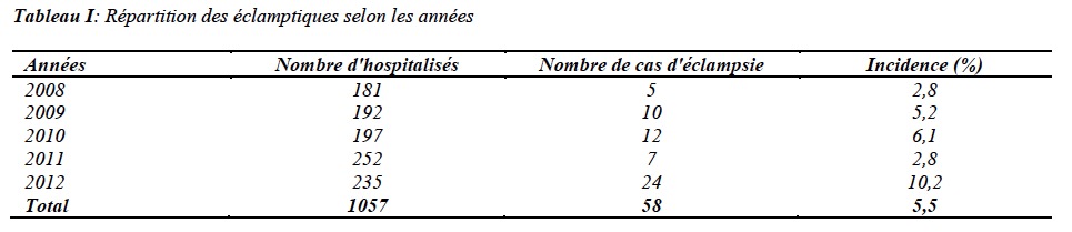 Au cours de la période de l’étude, nous avons colligé 64 cas d’éclampsies admises dans le service de réanimation polyvalente du CHUYO sur 1057 hospitalisations soit une prévalence de 6,1% des admissions du service. Parmi ces patientes, 58 ont été incluses dans notre étude. L’incidence de l’éclampsie a augmenté progressivement au cours des cinq années (tableau I) mais nous n’avons pas observé une variation saisonnière de cette incidence.