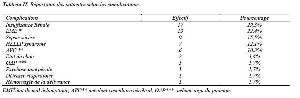 Il n’y avait pas d’association statistiquement significatif entre le moment de survenu de la crise par rapport à l’accouchement et le pronostic maternel (p = 0,78). Le nombre moyen de crises convulsives était de 3,8 crises et 35% des patientes ont présenté au moins cinq crises convulsives entre le début des convulsions et l’admission en réanimation. Le score moyen de Glasgow était de 9,5±4 et 22 patientes soit 38,6% étaient dans le coma (score de Glasgow ≤ 7). L’oligurie et l’anurie étaient respectivement observées chez sept patientes (13,7%) et quatre patientes (7,8%). La pression artérielle était sévère chez 23 patientes (39,7%). Le sulfate de magnésium était majoritairement utilisé (36 cas soit 62,1%) pour le traitement anticonvulsivant. Il était associé au diazépam dans 11 cas soit 19%. La nicardipine était l’antihypertenseur de choix dans 86,4% des cas. L’insuffisance rénale était la complication la plus associée à l’éclampsie (29,3%). Les complications associées à l’éclampsie observées dans notre série sont représentées dans le tableau II.