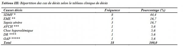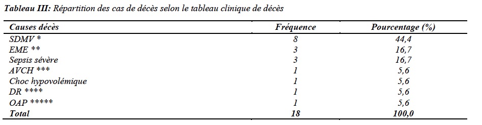 L’évolution était favorable chez 58,6% des patientes. Dix-huit cas de décès maternels ont été enregistrés (31% de mortalité). Le tableau clinique de décès le plus fréquemment rencontré était le syndrome de défaillance multiviscérale (SDMV). Le tableau III représente la répartition des cas de décès selon le tableau clinique de décès.