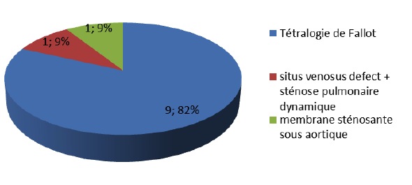 La tétralogie de Fallot était prédominante avec 36,8% suivie de la communication inter-ventriculaire avec 26,3% dans la série de BEYE [5]. Selon Hoffman JL et al [6] les proportions de 60 à 70% pour la tétralogie de Fallot et de 20 à 30 % pour la communication inter-ventriculaire ont été rencontrées.