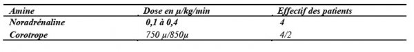 Les amines : dans la quasi-totalité des cas la noradrénaline a été l’amine la plus sollicitée, dans 10 cas versus Milrinone (Corotrope(R)) dans un cas