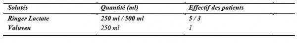 le Ringer lactate a été le soluté de remplissage le plus sollicité au cours de cette période opératoire utilisé chez 8 patients (tableau I).