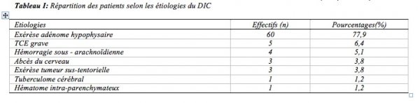 Nous avons noté une nette prédominance masculine avec 54 hommes, contre 23 femmes, soit un sex-ratio de 1,02. Les étiologies du DIC étaient largement dominées par les exérèses d’adénomes hypophysaires (60cas), suivies des traumatismes crânio-encéphaliques (TCE) graves (5cas) et des hémorragies sous-arachnoïdiennes (4cas). (Tableau I)
