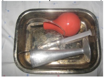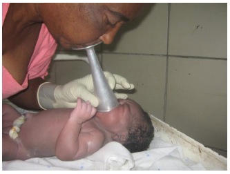 Depuis plus de 4ans, le manque d’IPM a conduit les sages femmes et les médecins de la maternité de l’hôpital de base de Talangaï à pratiquer la ventilation par un matériel inhabituel : le stéthoscope de pinard. Au départ, les sages femmes utilisaient le bouche-à-bouche protégé par une compresse pour la ventilation, puis, pour éviter une éventuelle contamination des nouveau-nés, elles ont voulu interposer un outil entre leur bouche et celle des nouveau-nés. Ainsi est venue l’idée d’utiliser le stéthoscope de pinard (voir photo 1). Après des années d’utilisation, nous pouvons dégager les avantages et les inconvénients de la méthode dans un milieu sous équipé.