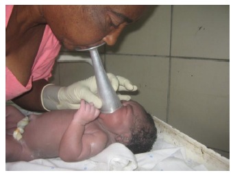 L’utilisation : facile, ne nécessite pas une grande formation, donc accessible à tout le monde. Ceci est important car dans certains milieux ruraux en Afrique, les accouchements sont pratiqués par des matrones et des accoucheuses traditionnelles. Après les mesures initiales de la réanimation néonatale en salle de naissance (séchage, mise au chaud, libération des voies aériennes), le stéthoscope est posé de sorte que le pavillon recouvre à la fois la bouche et le nez du nouveau-né de manière étanche et la partie auriculaire est destinée au personnel de santé pour des insufflations (Voir photo 2 et 3).