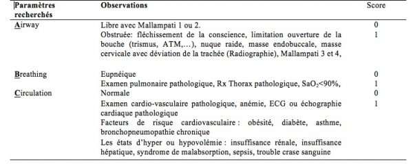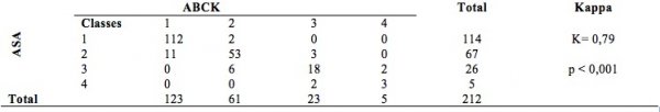 Méthodologie Il s’agit d’une étude prospective réalisée du 01 Décembre 2013 au 30 juillet 2014 à l’hôpital Saint Joseph. Tous les patients venus en consultation pré-anesthésique ont été évalués au moyen du score ASA et de l’ABC score de Kinshasa (ABCK) repris au tableau I. La classe ABCK du patient était obtenue par la somme des chiffres trouvés additionnée de un. Etaient exclus, les femmes enceintes et les enfants. Le consentement éclairé était obtenu. La conformité du nouveau score était évaluée par le test kappa de Cohen.