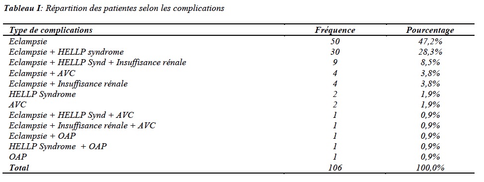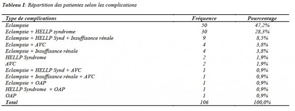 La césarienne était pratiquée dans 60,4% des cas. L’état de mal convulsif était le principal motif d’admission (91,4%) avec 42,5% de convulsions à l’admission. Le score de Glasgow moyen à l’admission était de 9 ± 2 (extrêmes : 6 et 15) avec 33% des patientes ayant un score de Glasgow ≤ 8. La prééclampsie a été revelée par les complications dans 70,8% des cas. Celles ci survenaient le plus souvent en prépartum (59,4%). Les complications retrouvées étaient : l’éclampsie (94,3%), le HELLP syndrome (40,5%), l’insuffisance rénale (13,2%), les accidents vasculaires cérébraux (7,5%) et l’oedème aigu du poumon (2,8%). Elles s’associaient le plus souvent entre elles (tableau I)