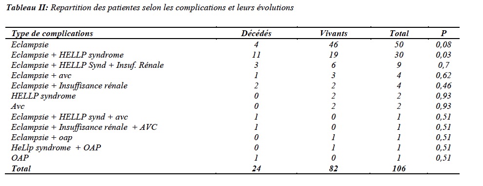 Humaine ; 20% et 35,8% pour les concentrées érythrocytaires. L’hémodialyse a été realisée chez 7 patientes sur 14 presentant une insuffisance rénale. La durée moyenne de séjour des patientes sous sulfate de magnésium était de 5,4 ± 4,2 jours (extrêmes : 1 et 24 jours) contre 6,2 ± 6,2 jours (extrêmes : 1 et 24 jours) pour celles qui ont réçu un antihypertenseur et un anticonvulsivant. La durée moyenne globale de séjour était de 6 ± 6 jours (extrêmes : 1 et 24 jours). Le taux de décès était de 22,6%. Le décès était plus fréquent chez les patientes associant éclampsie et HELLP syndrome (P= 0,03) (Tableau II)
