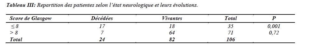 De même que chez les patientes admises avec un score de Glasgow ≤ 8 (P= 0,001) (Tableau III).