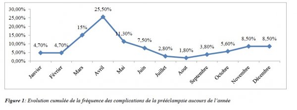Pendant la période d’étude, nous avons recencé 106 dossiers sur 866 admissions, soit une prévalence de 12,3%. L’âge moyen était de 24,3 ± 6,2 ans (extrêmes : 14 et 42 ans). La moitié de nos patientes était non scolarisée. Les principaux antécédents retrouvés chez nos patientes étaient : l’hypertension artérielle (7,5%), la prééclampsie (2,8%) et l’éclampsie (3,8%). Les primipares prédominaient avec 66%. Le nombre moyen de consultations prénatales réalisées par les patientes était de 2 ± 2,12 (extrêmes : 0 et 6). La fréquence des complications était elevée du mois de mars à mai (figure 1).