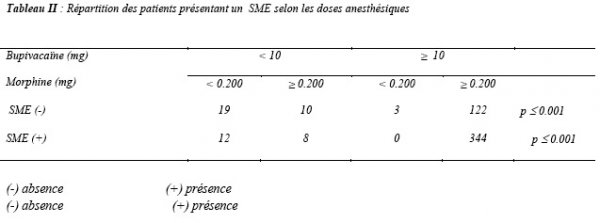 A des doses égales de bupivacaine, les complications étaient plus fréquemment retrouvées pour des doses de morphine ≥ 0.200 mg (tableau II).