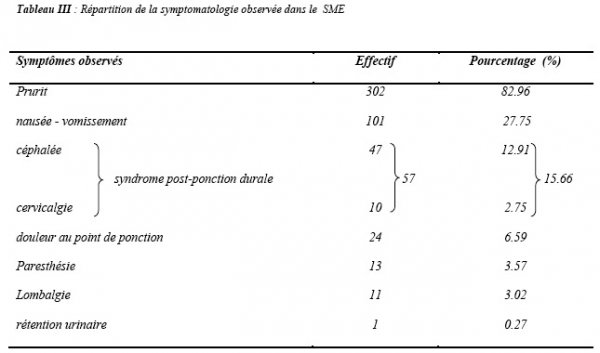 Pour des doses variables de bupivacaine et une dose à 0.025 mg de fentanyl, les complications concernaient 28.57 p.100 des patients. Les signes cliniques observés chez les patients présentant un mal-être, ont été recensés par ordre décroissant, dans le (tableau III).