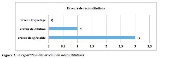 La catégorie des erreurs de reconstitution comporte comme indiquée sur la figure 1 ; les erreurs de dilution d’un médicament et les 3 erreurs de spécialités dues à un problème de sélection du médicament au moment de la reconstitution ou à une erreur de contrôle due à un problème d’étiquetage