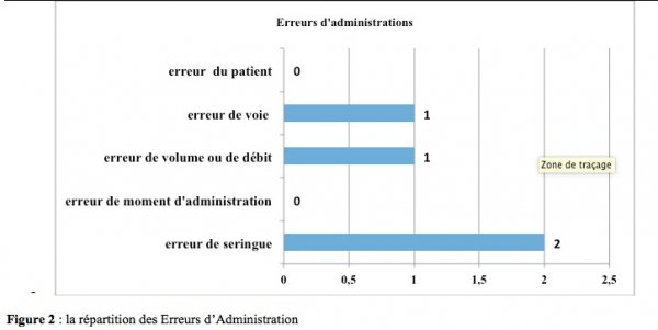 La catégorie des erreurs d’administration comporte comme indiquée sur la figure 2 ; les deux erreurs de seringues dues à un problème de sélection ou de contrôle qui ont conduit à l’administration d’un médicament par défaut à la place d’un autre ; l’erreur de volume ou de débit ayant conduit à l’administration d’un médicament par la voie Intraveineuse directe alors qu’il fallait l’administrer par perfusion intraveineuse lente et l’erreur de voie d’administration ayant conduit à l’injection d’un médicament par voie intraveineuse alors qu’il fallait l’administrer par voie intramusculaire