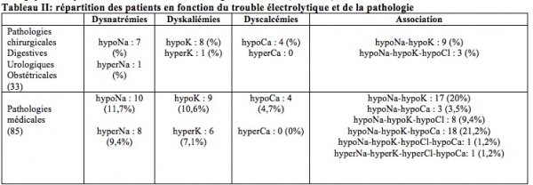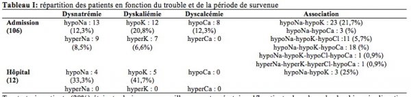 Résultats : Durant la période étudiée, 201 patients étaient admis en réanimation. 118 patients (59%) présentaient des troubles électrolytiques parmi lesquels 106 patients à l’admission (53%) et 12 autres durant leur hospitalisation (6%). Il y avait 42 hommes et 76 femmes. L’âge moyen des patients était de 35 ± 19 ans avec des extrêmes de 3 ans et 81 ans. A l’admission, 23 patients (21,7%) associaient une hyponatrémie et une hypokaliémie. Une hypernatrémie était retrouvée chez 9 patients (8,5%). Une hypokaliémie était retrouvée chez 5 patients (41,7%) ne présentant aucun trouble électrolytique à l’admission (tableau I).