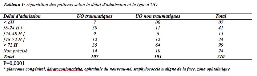 Le tableau 1 montre la répartition des cas selon le délai d’admission et le type d’urgence
