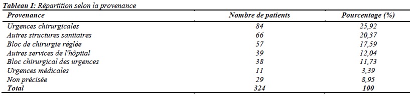 L’admission des patients en réanimation, qu’elle soit réalisée par entrée directe ou transfert, implique une continuité des soins. Les modalités d’admission en réanimation sont variables. En Europe, l’admission directe des patients en réanimation est assez répandue grâce à la régulation des SAMU [1]. L’objectif de cette étude, était de voir les modalités d’admission des patients en réanimation et leurs conséquences dans l’évolution et notamment leur corrélation avec la mortalité.