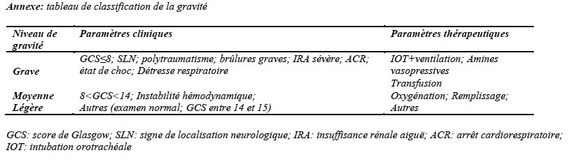 2. Aguèmon AR, Padonou JL, Yévègnon SR, Hounkpè PC, Madougou S, Djagnikpo AK, Atchadé D. Traumatismes crâniens graves en réanimation au Bénin de 1998 à 2002. Ann Fr Anesth Réanim 2005 ; 24 : 36-39 3. Ndiaye A, Camara S,Ndoye A, Dansokho A. Sow CM, Ndiaye PD, Bassène N. Mortalité par accident de la voie publique au centre de traumatologie et d’orthopédie de Grand-Yoff : bilan de deux années. A propos de 156 décès. Méd Trop 1993 ; 53 : 487-89 4. Diouf E, Beye MD, Diop Ndoye M, Kane O, Diouf MM, Seydi AA, NDiaye PI, Ka Sall B. Evaluation de la prise en charge hospitalière des polytraumatisés au CHU Aristide Le Dantec de Dakar. Etude prospective à propos de 106 cas. Dakar Médical 2003 ; 48 : 117-22 5. Meyer AA. Death and disability from injury : a global challenge. J Trauma 1998 ; 44 : 1-12. 6. Misset B, Naiditch M, Saulnier F, Fosse JP, Pinsard M et al. Construction d’une classification diagnostique pour le groupage médico-économique des patients de réanimation Informatique. Informatique et Gestion Médicalisée 1997 ; 39-46 7. Moreno RP, Matmitz PGH, Almeida E, Jordan B, Bauer P et al. SAPS 3 – from evaluation of the patient to evaluation of the intensive care unit. Part 2 : development of a prognostic model for hospital mortality at ICU admission. Intensive care med. 2005 ; 31 : 1345-355 8. Nguyen HB, Rivers EP, Havstad S, Knoblich B, Ressler JA, Muzzin AM, Tomlanovich MC. Critical care in the emergency department : A physiologic assessment and outcome evaluation. Acad Emerg Med. 2000 ; 7 : 1354-361. 9. Boffelli S, Rossi C, Aughileri A, Giardino M, Carnevale I, Messina M, Neri M, Langer M, Bertolini G. Continuous quality improvement in intensive care medicine. The GiViTI Margherita Project -Report 2005 Minerva anestesiol 2006 ; 72 : 419-