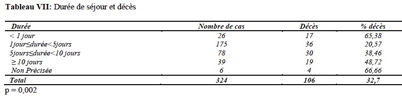 Le tableau VII montre les taux de décès en fonction de la durée de séjour.