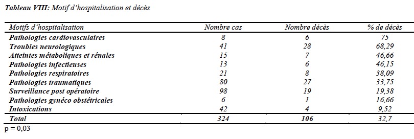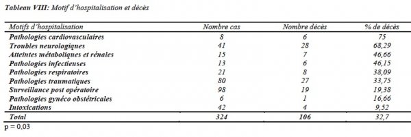 Le tableau VIII montre les taux de décès en fonction des différents motifs d’hospitalisation.