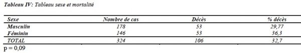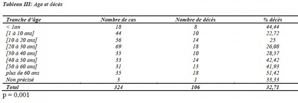 Le tableau III montre les taux de décès en fonction des différentes tranches d’âge avec une mortalité plus élevée aux âges extrêmes.