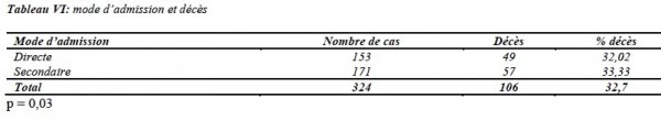 Le tableau VI montre les taux de décès en fonction du mode d’admission.