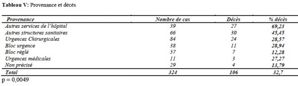 Le tableau V montre les taux de décès en fonction de la provenance.