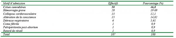 L’hypertension artérielle gravidique (HTAG) sévère et l’hémorragie obstétricale représentaient les principales causes d’hospitalisation dans notre série soit 67,95% et 24,36%. Ces pathologies hypertensives et hémorragiques constituent les causes majeures d’hospitalisation en réanimation selon les séries rapportées dans la littérature [5, 7]. Les crises convulsives étaient les principales manifestations cliniques de cette forme sévère de l’HTAG soit 46,8% .