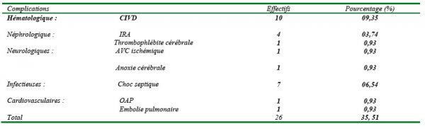 L’incidence élevée de ces complications est rapportée par plusieurs travaux [3 ,5, 6,7] Dans une série réalisée en Côte d’Ivoire ,les complications étaient dominées par le sepsis 30cas ;l’ accident vasculaire cérébral hémorragique (AVC) 16cas ; l’insuffisance rénale 15 cas ; la Coagulation intra vasculaire disséminée (CIVD) 15 cas ; l’OEdème aigu pulmonaire (OAP) 11 cas ; l’hypothermie 7cas ; Hellp Syndrome 6 cas [ 6] .