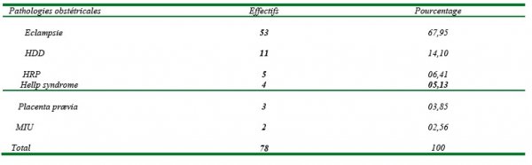 Nous avons analysé l’épidémiologie, le motif d’admission, le diagnostic, les complications et le pronostic maternel de la pathologie obstétricale.