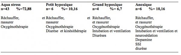 Tous les patients ont été réchauffés et surveillés au plus de 24 heures. Les lésions associées étaient : un traumatisme crânien (n=2), une fracture de côte associée à une contusion pulmonaire (n=1) compliquée d’un SDRA (Syndrome de détresse respiratoire aigüe) et une fracture du membre supérieur (n=5). La radiographie pulmonaire et la gazométrie ont mis en évidence respectivement des opacités nodulaires diffuses (n=48 ; 81,35%), une hypoxémie (une saturation située entre 90 et 96%) et une hypercapnie (PaC02 > 35 mmHg) (n=32 ; 54,23%). Quarante-sept (47) patients ont été guéris, 9 autres ont été transférés dans les services suivants : en neurologie médicale (n=2), en traumatologie (n=5) et en chirurgie pédiatrique (n=2). La noyade a été mortelle lors de certaines activités et n’impliquait que des hommes : trois décès au cours d’un voyage par le fleuve, 1 lors d’un bain dans la mer et 1 enfant de 3 ans dans une piscine privée abandonnée. La durée moyenne de séjour était de 1,4 ± 1,3 jour.