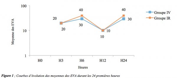 La proportion de patiente n’ayant pas eu besoin de morphine en postopératoire était de 60% dans le groupe « IR ». Cette proportion était de 82% dans le groupe « IV » (OR=1.70 [0.91-3.19] ; p=0.07). Dans les deux groupes, le délai d’administration de la morphine était de 4heures. Les courbes d’évolution des EVA dans les deux groupes sont illustrées dans la figure 1.