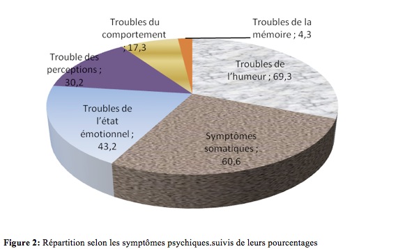 Ces troubles sont représentés sur la figure 2. 8, 7 % des victimes ont présenté des symptômes d’allure psychotique. Nous avons noté des sentiments de culpabilité, de révolte et de découragement chez 30, 43% des sujets. Les quelques exemples de propos ci-dessous recueillis auprès des victimes en sont une illustration : « J’aurais dû ne pas accepter cette mission »