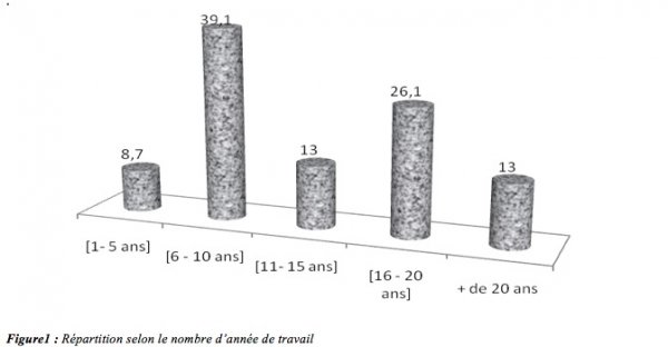 Les marins étaient d’origine philippine (91%) et russe (9%). Ils étaient mariés dans 87% des cas. Leur âge variait entre 25 et 60 ans avec une moyenne d’âge de 40,7 ± 8,47ans. La répartition en fonction du nombre d’années d’expérience professionnelle est représentée dans la figure 1