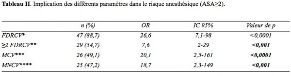 Au total 75 patients ont été inclus, repartis en 44 (58,7%) hommes et 31 (41,3%) femmes (sex-ratio : 1,42). L’âge moyen était de 65±8,8 ans (extrêmes : 42-84 ans), dont 67,2±8,8 ans pour les hommes et 62±7,9 ans pour les femmes. L’IMC moyen se chiffrait à 24,8±5,4 (extrêmes : 17-38) ; selon le sexe, il était de 23,4±4,7 pour les hommes et 26,7±5,9 pour les femmes, la différence était significative (p<0,05). Le QTc moyen était de 417,2±32,9 ms (extrêmes 304-498), soit 415±31,4 ms pour les hommes et 420,3±35,1 ms pour les femmes (p=0,28). La répartition des patients selon le sexe et les facteurs de risque cardiovasculaire est indiquée dans le tableau I. Un seul facteur de risque cardiovasculaire a été noté chez 52 (69,2%) patients dont 23 (74,2%) femmes et 29 (65,9%) hommes. Au moins deux facteurs de risque cardiovasculaire ont été répertoriés chez 32 (42,7%) patients, à raison de 15 (48,4%) femmes et 17 (38,6%) hommes. Une maladie cardiovasculaire établie était retrouvée chez 27 (36%) patients, parmi lesquels 15 (48,3%) femmes et 12 (27,3%) hommes. Un état pathologique non cardiovasculaire a été identifié chez 9 (29%) femmes et 17 (38,6%) hommes, soit 26 cas.Selon la classification ASA, 22 patients (29,3%) figuraient dans la classe ASA 1, dont 7 (22,6%) femmes et 15 (34,1%) hommes. La classe ASA≥ 2 concernait 53 patients (70,7%), soit 24 (77,4%) femmes et 29 (65,9%) hommes. L’implication d’un seul facteur de risque cardiovasculaire, d’au moins deux facteurs de risque cardiovasculaire, d’une maladie cardiovasculaire établie et d’un état pathologique non cardiovasculaire dans le déterminisme du risque anesthésique (ASA≥2) est rapportée par le tableau II.