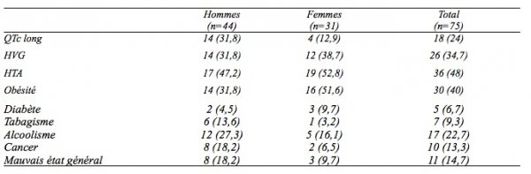 Définitions opérationnelles:L’obésité pondérale était définie par un IMC>25. Le diabète était défini par une glycémie à jeun>1,26 g/l ou la prise de médication hypoglycémiante. L’HVG était retenue si l’indice de Sokolov-Lyon ≥ 3,5 mm ou de Cornell ≥ 20 mm chez les hommes et ≥ 28 mm chez les femmes. L’alcoolisme était défini par une consommation régulière pendant les 12 derniers mois [8], le tabagisme actif par le fait de fumer quotidiennement ou occasionnellement ou avoir arrêter de fumer depuis moins de deux ans [9]. Le QT corrigé (QTc) était calculé par la formule de Bazett (QT mesuré /√RR). Le QTc était considéré long s’il était supérieur à 430 ms chez l’homme et supérieur à 450 chez la femme [10]. Une maladie cardiovasculaire établie consistait en la présence d’une insuffisance cardiaque (IC) prouvée et traitée comme telle ; d’antécédents d’accident vasculaire cérébral (AVC), et d’une HVG. L’altération de l’état général était évaluée par l’indice de Karnorsfki.