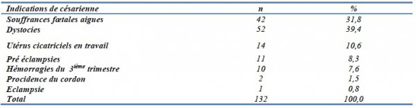Les principales indications des césariennes en urgence sont données dans le tableau I.