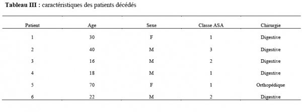 Le taux de mortalité était estimé à 1,1%. La répartition des décès peropératoires selon l’âge, le sexe, la classe ASA et le type de chirurgie est rapportée dans le( tableau III).