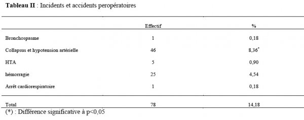 Les incidents et accidents peropératoires recensés se chiffraient à 78, soit une incidence de 14,2% ; ils étaient essentiellement cardiovasculaires (98,7% ; p<0,001). Le (tableau II ) indique les différents incidents et accidents peropératoires rencontrés.