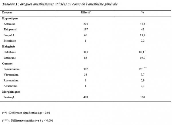 La majorité des anesthésies en urgence était réalisée chez des patients de classe ASA 1 (89%) et 2(9%) ; 2% des patients étaient classés ASAIII. L’anesthésie générale a été la technique anesthésique la plus utilisée en urgence (78% des cas ; p < 0,01). La sédation et l’anesthésie locorégionale occupaient le deuxième et le troisième rang : 11% et 10% ; ces deux techniques étaient associées dans 1% des cas. Quant aux drogues anesthésiques (tableau I), la kétamine était l’hypnotique intraveineux le plus utilisé (43,5%), suivie par le thiopental (42,0%), et le propofol (13,8%). Quant aux halogénés, ils étaient dominés par l’halothane (74,2% ; p<0,02). Le fentanyl était le seul morphinique utilisé en peropératoire.