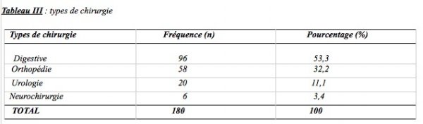 Seize enfants (8,8%) ont été transfusés. La chirurgie était réglée dans 147 cas (81,7%) et en urgence dans 33 cas (18,3%). La durée moyenne de la chirurgie était de 01 heure (extrêmes 7 minutes et 4,5 heures). La place des différentes pathologies chirurgicales est représentée dans le tableau III
