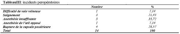 La totalité des actes chirurgicaux s’était déroulée sous anesthésie loco-régionale. Le bloc péribulbaire, réalisé selon la technique de Davis et Mandel était le plus utilisé : 55 patients (83,3% ; p<0,01). Onze patients (16,7%) avaient bénéficié du bloc rétrobulbaire selon la technique d’Atkinson. La majorité des blocs anesthésiques (n=61, soit 92,5% ; p<0,001) a été réalisée par les ophtalmologistes. La dose moyenne de la lidocaïne à 2% utilisée était de 6,6±1,5 ml. Les incidents peropératoires retrouvés étaient dominés par l’insuffisance d’anesthésie (35,7%), la rupture capsulaire postérieure (28,6%) et le saignement du site opératoire (21,4%) par rapport à l’ensemble de complications (tableau III).