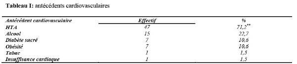 L’HTA est, l’antécédent cardiovasculaire le plus rencontré (tableau I),