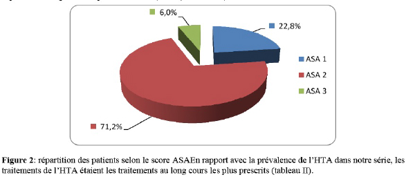 Il concernait 47 patients (71,2% ; p<0,01) dont 22 (46,8%) cas d’HTA de découverte récente. L’obésité, définie par un indice de masse corporel supérieur à 30 kg/m2, était présente chez 7 (10,4%) patients. L’évaluation du risque anesthésique périopératoire par le score ASA permettait de classer ASA 2 47 patients (71,2% ; p<0,01) (figure 2).