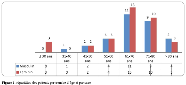 Au total, 66 patients d’âge moyen 65,6 ±15,5 ans (extrêmes : 13-92 ans) ont été opérés pendant la campagne, dont 52,9% des femmes (p>0,05). La majorité des patients (52 cas, soit 76,5% ; p<0,01) étaient âgés de plus de 60 ans (figure1).