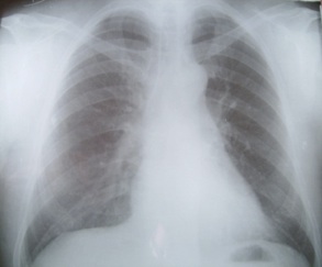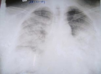 Il s’agissait d’un homme âgé de 45 ans d’origine Malgache, médecin, domicilié à Itaosy Antananarivo, sans antécédent particulier admis au service de Réanimation médicale de l’Hôpital Joseph Raseta Befelatanana (CHU d’Antananarivo) le 28 Novembre 2009 pour une dyspnée aiguë.Le début de la maladie remonterait au 27 novembre 2009 par un syndrome grippal traité sans succès avec du paracétamol et des mucolytiques (N acétyl cystéine).Le patient a été hospitalisé en réanimation devant la majoration de la dyspnée avec orthopnée.A l’admission en réanimation, le patient était conscient, l’hémodynamique était stable. On notait une polypnée à 44 cycles/min, une cyanose, des sueurs, des râles crépitant diffus dans les deux champs pulmonaires et une hyperthermie à 40°C. Devant ce tableau clinique, la radiographie pulmonaire (Fig. 1) a montré des opacités alvéolaires diffuses, bilatérales évocatrices d’un œdème aigu du poumon. L’électrocardiographie (ECG) montrait une tachycardie sinusale régulière.