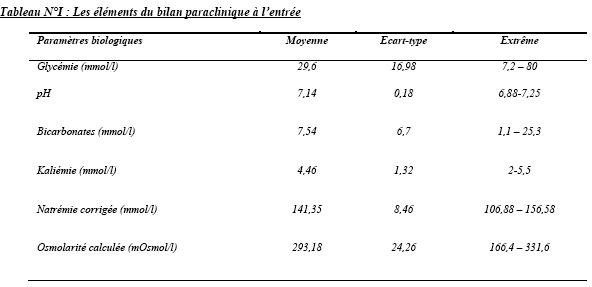 Les valeurs moyennes de glycémie étaient élevées chez nos patients, une glycosurie et une cétonurie supérieure à deux croix étaient retrouvées chez tous les patients, il en était de même pour l’acidose métabolique (tableau I).
